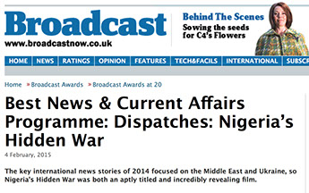 http://www.broadcastnow.co.uk/home/broadcast-awards/broadcast-awards-at-20/best-news-and-current-affairs-programme-dispatches-Nigerian-hidden-war/5082596.article